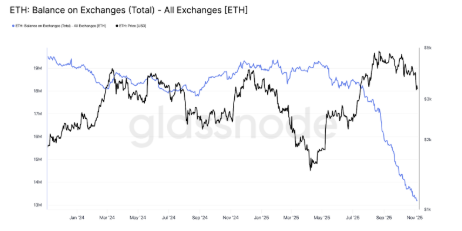 Los datos de Glassnode muestran que el balance de ETH en exchanges cayó de 17 millones a 13,14 millones desde agosto, marcando su nivel más bajo desde 2016.