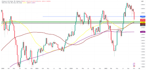 Los gráficos de Cointelegraph Markets Pro y TradingView muestran una zona de soporte clave entre 3.000 $ y 3.150 $, delimitada por las medias móviles simples de 50 y 100 semanas.