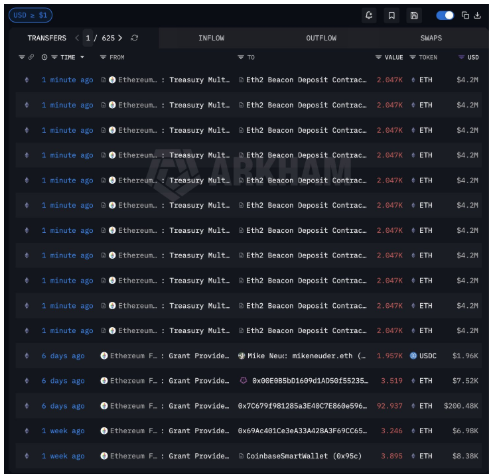 Ethereum Foundation ha acelerado su plan de staking al realizar su mayor movimiento hasta la fecha, depositando 22.517 ETH (~$46.2 millones) en el contrato de validación de la red. Esta operación se ha dividido en 11 depósitos, reflejando una ejecución estructurada dentro de su estrategia de tesorería.