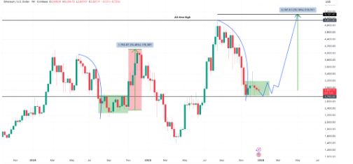 Desde el punto de vista técnico, ETH se mantiene por encima de los $2.750, un nivel que anteriormente actuó como resistencia antes de un rally del 74% en 2024. La estructura actual del precio recuerda a ese mismo patrón de consolidación, lo que abre la puerta a un movimiento hacia la zona de los $5.000 si el soporte se mantiene.