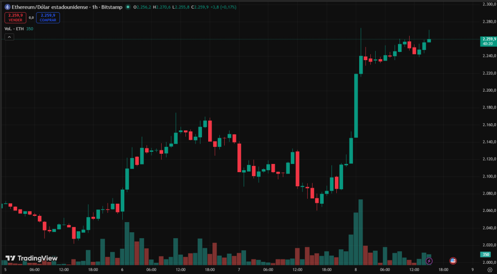 Ethereum cotiza en torno a los 2.254 dólares, registrando una subida del 8,38% en las últimas 24 horas. Este movimiento destaca frente al resto del mercado, posicionando a ETH como uno de los activos más fuertes en el corto plazo.