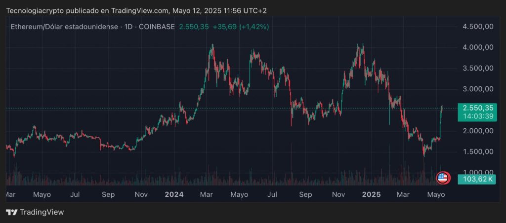 Desde el despliegue, el precio de ETH ha pasado de $1,786 (7 de mayo) a $2,550 (12 de mayo), marcando una subida del 42%.