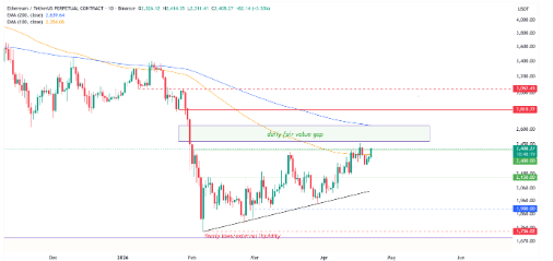 ETH también intenta recuperar su media móvil exponencial de 100 días, mientras la de 200 días se aproxima a la zona de $2.630, reforzando ese objetivo técnico.