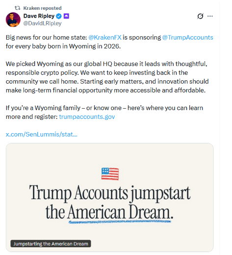 El exchange Kraken anunció que respaldará las denominadas “Cuentas Trump” en el estado de Wyoming, en respuesta al plan impulsado por el presidente Donald Trump para fomentar el ahorro de los menores de edad en Estados Unidos.