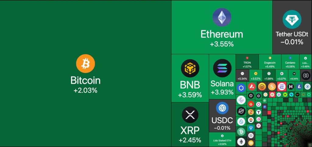 Según TradingView, Bitcoin (BTC) subió alrededor de 2 % hasta los 109.184 $, mientras que Ether (ETH) y BNB avanzaron cerca de 3,5 %, y Solana (SOL) repuntó casi 4 % hasta los 190,28 $.