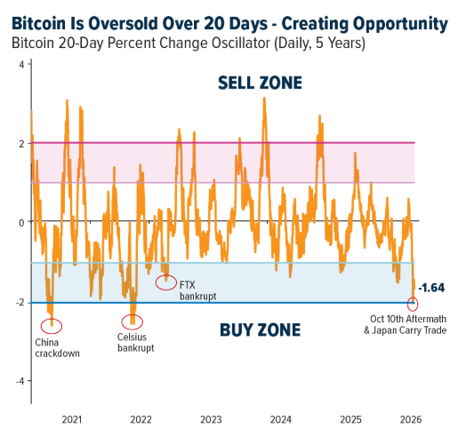 Por su parte, Frank Holmes, presidente de Hive Digital Technologies, señaló que BTC cotiza actualmente cerca de dos desviaciones estándar por debajo de su media móvil de 20 días, un nivel que solo se ha observado tres veces en los últimos cinco años.
