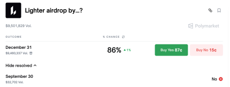 Los traders de Polymarket están valorando en un 86% la probabilidad de que el airdrop de Lighter se produzca antes del 31 de diciembre de 2025. El mercado ha acumulado alrededor de 9,5 millones de dólares en volumen, reflejando una fuerte convicción de que el evento ocurrirá antes de fin de año.