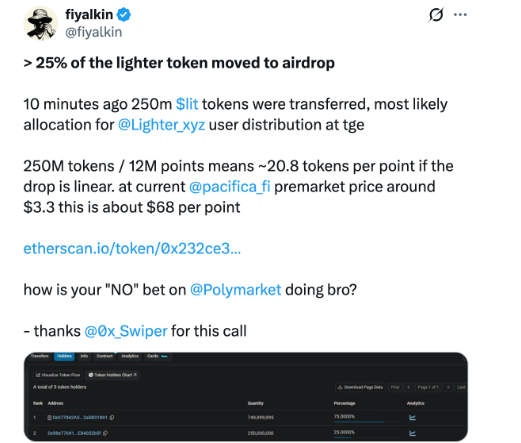 El viernes pasado, Lighter transfirió 250 millones de tokens LIT, equivalentes al 25% del suministro total, lo que avivó aún más la especulación sobre un airdrop inminente. El programa de puntos de la temporada 1 finalizó el 30 de septiembre, mientras que los puntos de la temporada 2 se distribuyen semanalmente.