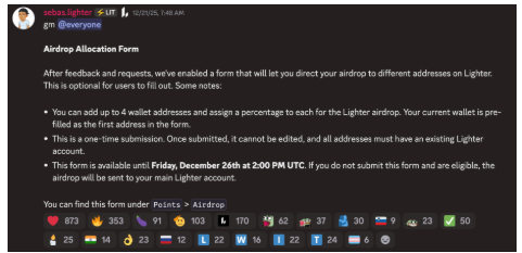 Además, Lighter habilitó un formulario de asignación de airdrop, mediante el cual los usuarios pueden distribuir sus tokens entre hasta cuatro wallets distintas. El formulario permanecerá abierto hasta el viernes; quienes no lo completen recibirán el airdrop en su cuenta principal.