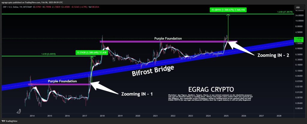 El analista destaca similitudes entre el comportamiento actual de XRP y su desempeño en 2017. Durante ese año, la criptomoneda experimentó un aumento exponencial tras superar la BMSB. Egrag sugiere que, si XRP sigue un patrón similar, podría estar al borde de una subida comparable, lo que justificaría su predicción de un incremento del 1.500% en las próximas semanas.