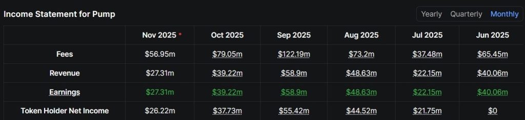 El desplome del mercado paralizó el frenesí memecoin. Según DefiLlama, los ingresos de Pump.fun cayeron a 27,3 millones de dólares en noviembre, frente a los 58,9 millones de septiembre.