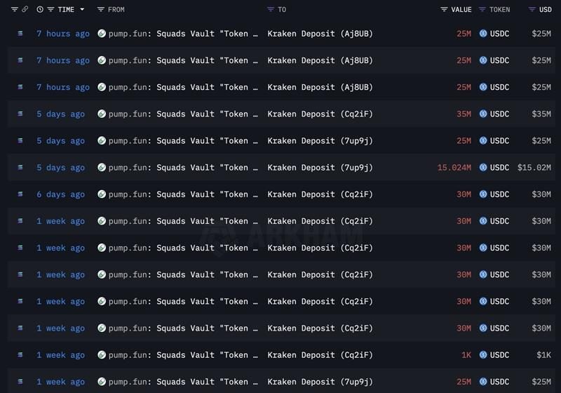 Pump.fun, el mayor launchpad de memecoins en Solana, ha transferido más de 436 millones de USDC a Kraken desde mediados de octubre, según Lookonchain.