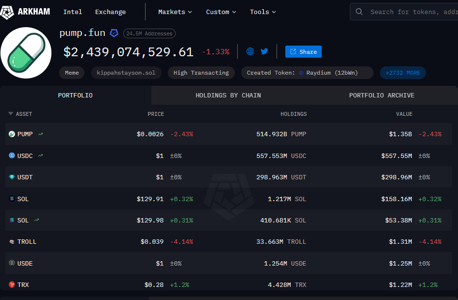 Según Arkham, la tesorería etiquetada de Pump.fun mantiene: