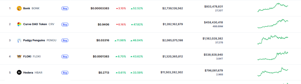 Altcoins: Bonk, CRV y Pudgy Penguins lideran
