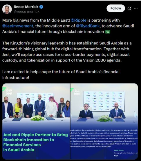 Ripple ha firmado un acuerdo de colaboración con Jeel, la unidad de innovación de Riyad Bank, para explorar el uso de tecnología blockchain en el sistema financiero de Arabia Saudí, reforzando el interés institucional por infraestructuras digitales avanzadas.