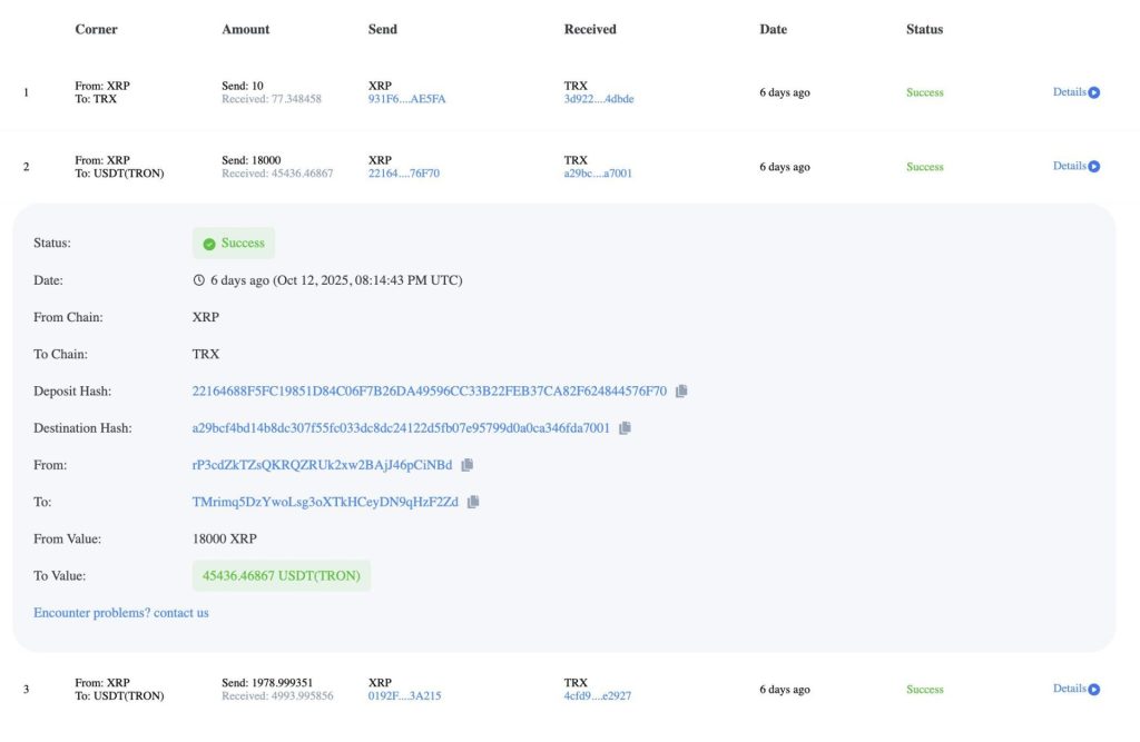 “Los atacantes movieron los fondos de XRP a Tron usando bridges y posteriormente los dispersaron mediante mercados OTC vinculados a Huione”, detalló ZachXBT en su hilo publicado el 19 de octubre.