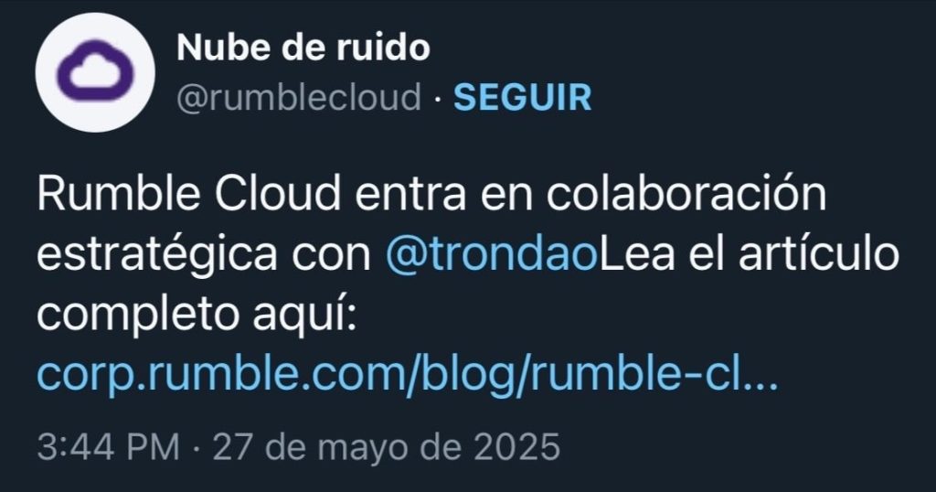 La plataforma de servicios en la nube y compartición de video, Rumble Cloud, ha anunciado una alianza estratégica con Tron DAO para acelerar la adopción de un Internet más abierto y descentralizado. El acuerdo tiene como objetivo ofrecer soporte a aplicaciones descentralizadas (dApps) y reducir la dependencia de los grandes proveedores de nube, como Amazon Web Services, Microsoft Azure o Google Cloud.