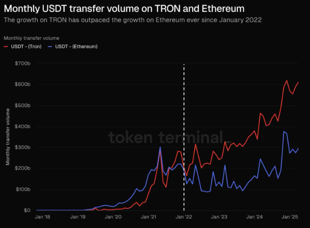 La alianza se produce en un momento de crecimiento récord para la red Tron. Según datos de Token Terminal, las transacciones en USDT sobre Tron alcanzaron un máximo histórico de $600 mil millones, consolidándose como la blockchain preferida para transferencias de stablecoins, superando a Ethereum en volumen y eficiencia.
