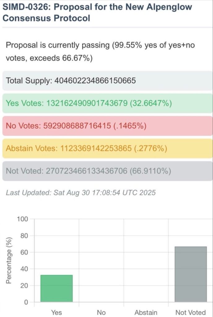 Solana se prepara para implementar la actualización Alpenglow (SIMD-0326), una mejora que reduciría la finalidad de las transacciones de más de 12 segundos a tan solo 150 milisegundos. Con más del 99% de apoyo de los validadores, esta mejora representa un avance de cien veces en velocidad y posicionaría a Solana como referencia en infraestructura descentralizada.