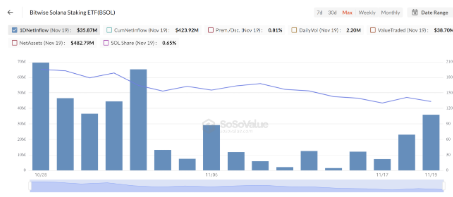 Bitwise BSOL domina el mercado con 424 millones, un 89% del total. El 19 de noviembre registró otros 35 millones en entradas, su tercer mejor día. Ese mismo día debutó el ETF de Solana de 21Shares con 100 millones en AUM, reflejando el fuerte apetito institucional pese al miedo extremo del mercado.