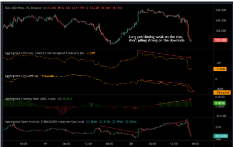 El CVD spot y de futuros cayó durante todo el día, mostrando venta neta constante, mientras que las tasas de financiación siguieron elevadas, dejando a los largos apalancados vulnerables a una caída más profunda.