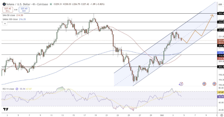 El precio de SOL/USDT se mantiene en una estructura técnica positiva, cotizando en torno a $227 y todavía por encima de las medias móviles de corto y medio plazo: