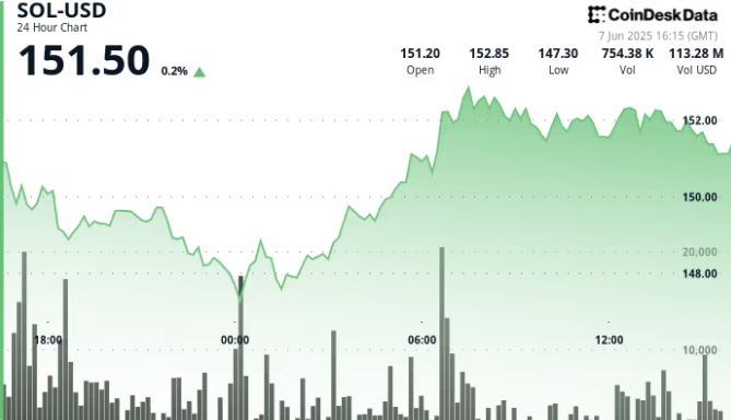 El precio de SOL sube casi un 4% y recupera el nivel de los $151, tras confirmar un patrón técnico de doble suelo y registrar fuerte actividad en cadena.