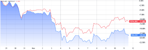 Sin embargo, el token retrocedió un 6% tras rozar los 172 $, reflejando el mismo debilitamiento del Nasdaq, presionado por la rebaja de previsiones de CoreWeave y las tensiones comerciales entre EE. UU. y China por los minerales raros.