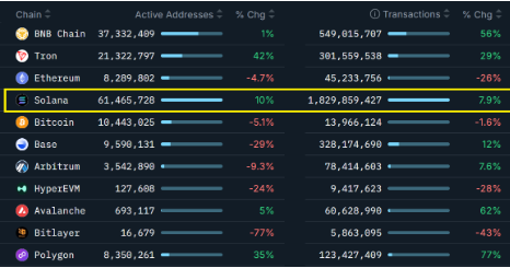 Durante los últimos 30 días, las direcciones activas en Solana aumentaron un 10% y las transacciones un 8%, superando ampliamente a Ethereum, que cayó un 26% en actividad.