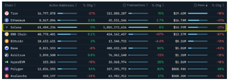 Aunque las tarifas de red de Solana bajaron un 21% en los últimos 30 días, el descenso fue menor que en redes competidoras. BNB Chain registró una caída del 67% y Ethereum del 41%, mientras que las transacciones en Solana crecieron un 6%, mostrando una resiliencia relativa en uso de red.