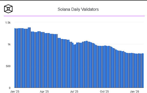 La red de Solana continúa perdiendo validadores activos, con el recuento diario cayendo por debajo de los 800 nodos, un nivel que no se veía desde 2021. Esto supone una caída superior al 65% desde el máximo cercano a los 2.500 validadores alcanzado a comienzos de 2023.