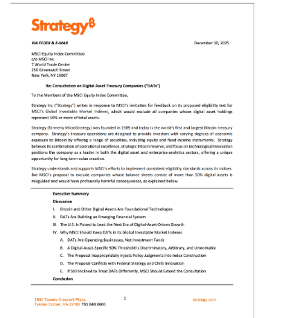 Strategy envió una carta formal a MSCI en rechazo a la propuesta que busca excluir de los índices bursátiles a empresas con más del 50% de su balance en criptomonedas. La firma sostiene que las tesorerías cripto sí son empresas operativas, capaces de ajustar su modelo y generar productos como instrumentos de crédito respaldados por Bitcoin.
