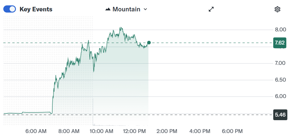 La noticia impulsó a WULF hasta un +48% intradía, alcanzando los $8,11 antes de cerrar en torno a $7,50 (+37% en el día), con un volumen de negociación más de cuatro veces superior a la media diaria. La capitalización bursátil se sitúa ahora cerca de los $3.000 millones.
