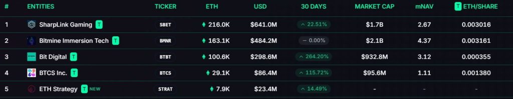 SharpLink destaca por adquisiciones recientes como 10.000 ETH el 11 de julio, 16.370 ETH el 13 de julio y otros 24.371 ETH (73,2 millones de dólares) esta semana.