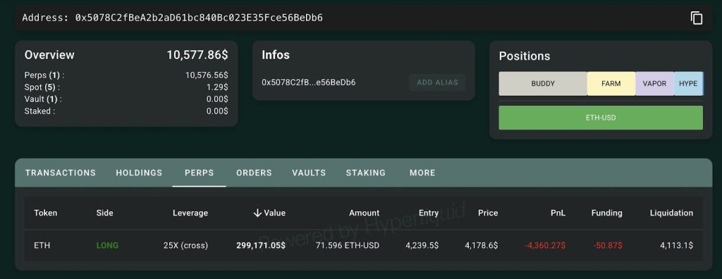 El multimillonario trader apalancado James Wynn también sufrió una liquidación parcial, quedándose con apenas 300.000 dólares en posiciones largas de ETH, que corren riesgo de liquidación si el precio cae por debajo de 4.113 dólares.