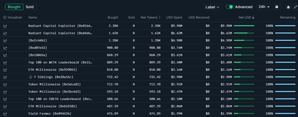 En contraste, algunos traders aprovecharon la caída como oportunidad de compra. El monedero 0x159 adquirió 3,4 millones en ETH, mientras que otras ballenas sumaron compras por encima de los 3 millones de dólares cada una. Incluso el conocido monedero del exploiter de Radiant Capital compró 16,6 millones en ETH durante la corrección.
