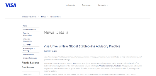 Visa anunció la creación de una unidad global de asesoramiento en stablecoins, destinada a ayudar a bancos, comercios y fintechs a diseñar, lanzar y gestionar productos basados en stablecoins. La iniciativa responde al creciente uso de dólares on-chain como canal de pago fundamental dentro del sistema financiero.
