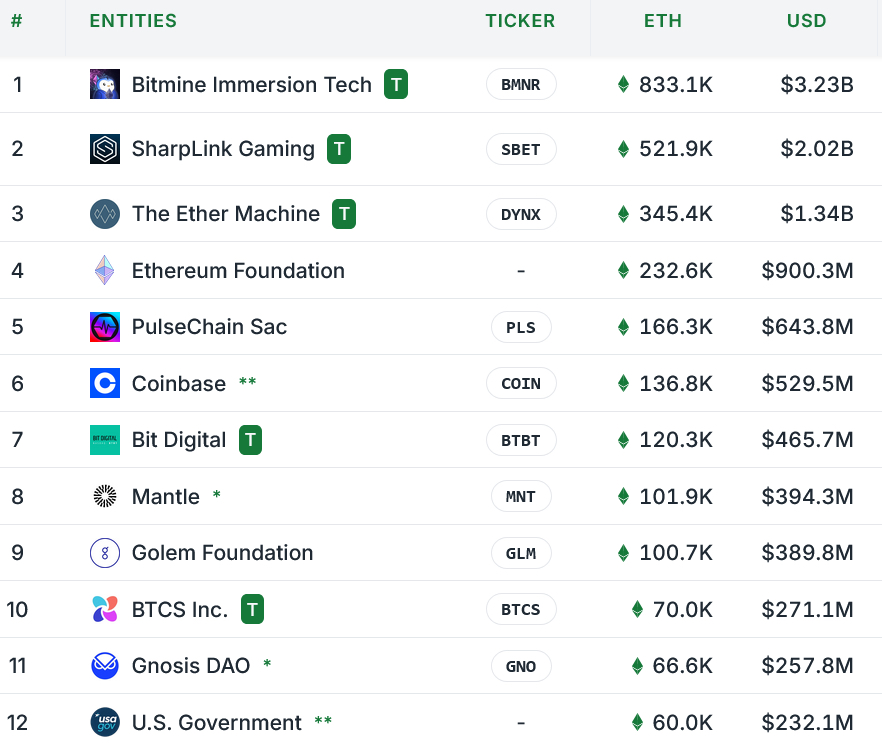 - BitMine Immersion Technologies: 833.100 ETH (3.200 M USD)
