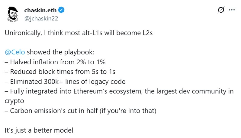 Todo comenzó cuando Jason Chaskin afirmó que muchas redes de capa 1 deberían transformarse en capas 2 de Ethereum, siguiendo el ejemplo reciente de Celo, que migró a la infraestructura de Ethereum para reducir inflación, optimizar tiempos de bloqueo y aprovechar su comunidad de desarrolladores.