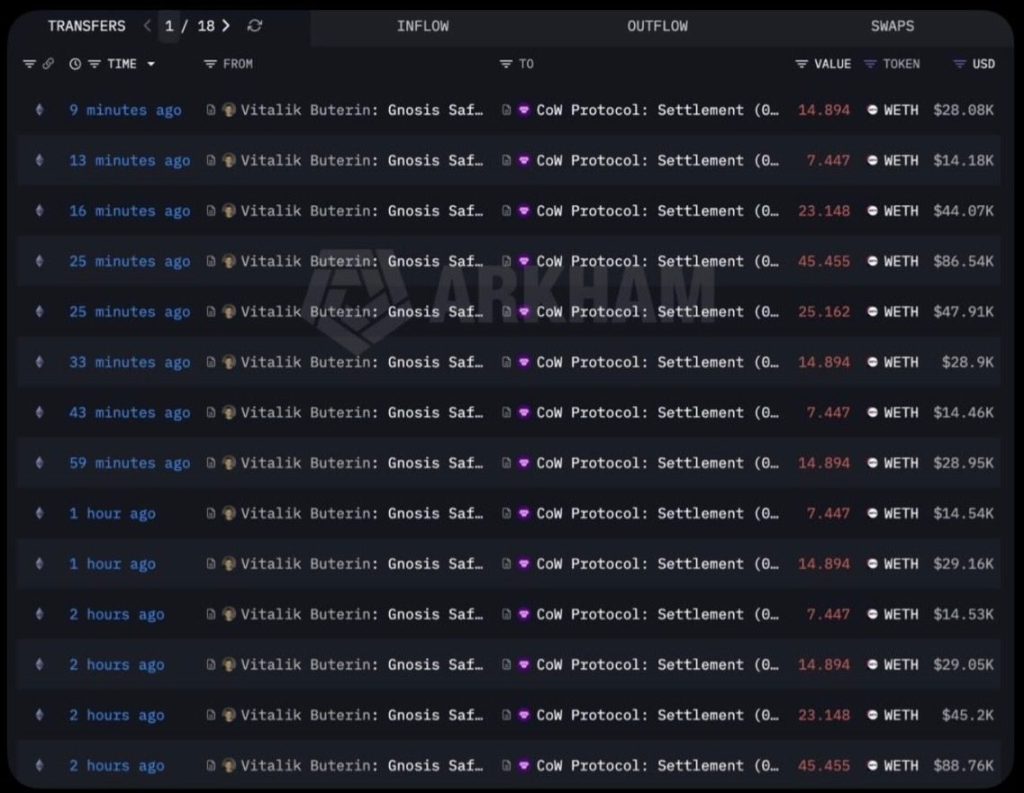 Datos on-chain muestran que Buterin realizó múltiples swaps a través de CoW Swap, reduciendo ligeramente su exposición directa en ETH.