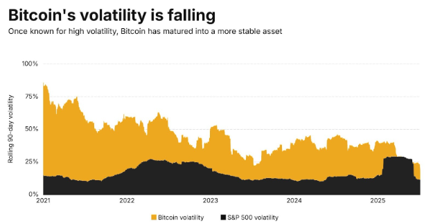 Aunque la percepción general es que Bitcoin es mucho más volátil que los mercados tradicionales, los datos muestran una tendencia descendente:
