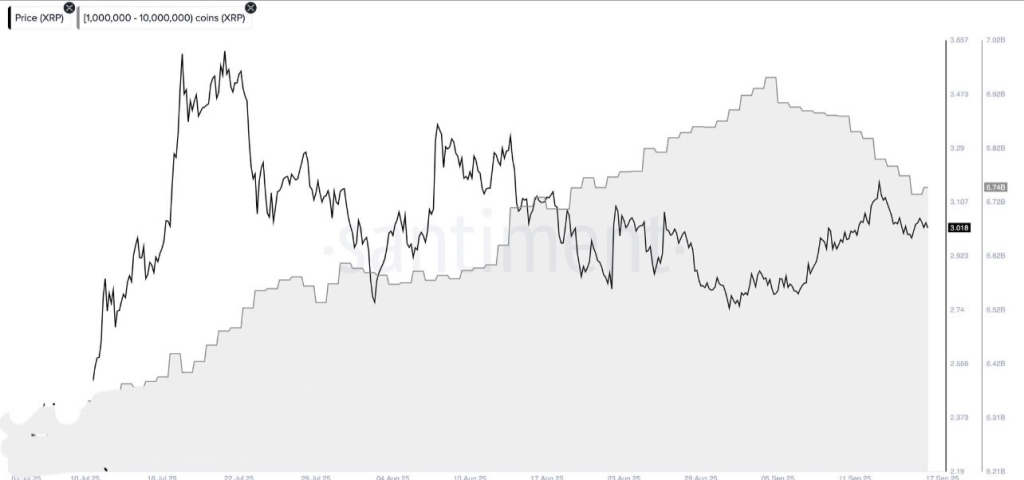 En los últimos 14 días, las wallets que poseen entre 1 y 10 millones de XRP han reducido sus tenencias en aproximadamente 200 millones de tokens, según datos de Santiment. Este grupo, considerado como mid-level whales, ha rebajado su saldo conjunto hasta los 6.74 mil millones de XRP, lo que refleja una salida significativa de capital del ecosistema.