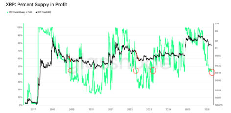 El porcentaje de XRP en beneficio ha caído al 43%, mínimos no vistos desde noviembre de 2024. Este dato es clave, ya que históricamente cuando este indicador baja del 50%, el mercado entra en fase de capitulación, con ventas impulsadas por pánico.