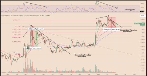 Pese al optimismo, el analista advierte riesgos técnicos relevantes. XRP todavía no ha recuperado de forma clara la EMA de 100 semanas ni la directriz bajista de largo plazo. En ciclos anteriores, movimientos similares terminaron siendo rebotes dentro de tendencias bajistas, seguidos de correcciones profundas.