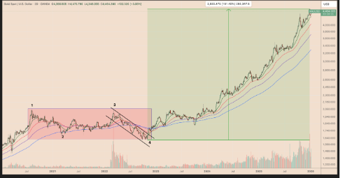El argumento alcista se apoya en el comportamiento del oro entre 2020 y 2022, cuando el metal precioso pasó casi dos años consolidando antes de romper resistencias clave. Tras esa ruptura en noviembre de 2022, el oro entró en una fase de expansión sostenida que culminó en máximos históricos a finales de 2025.