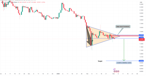 El objetivo técnico proyectado del patrón se sitúa en USD 0,95, aproximadamente un 29% por debajo del nivel actual. En escenarios extendidos, algunos analistas contemplan incluso niveles cercanos a USD 0,80.