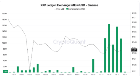 Datos onchain muestran que más de 472 millones de XRP (≈USD 652M) fueron transferidos recientemente a Binance, marcando el mayor flujo hacia exchanges en febrero.