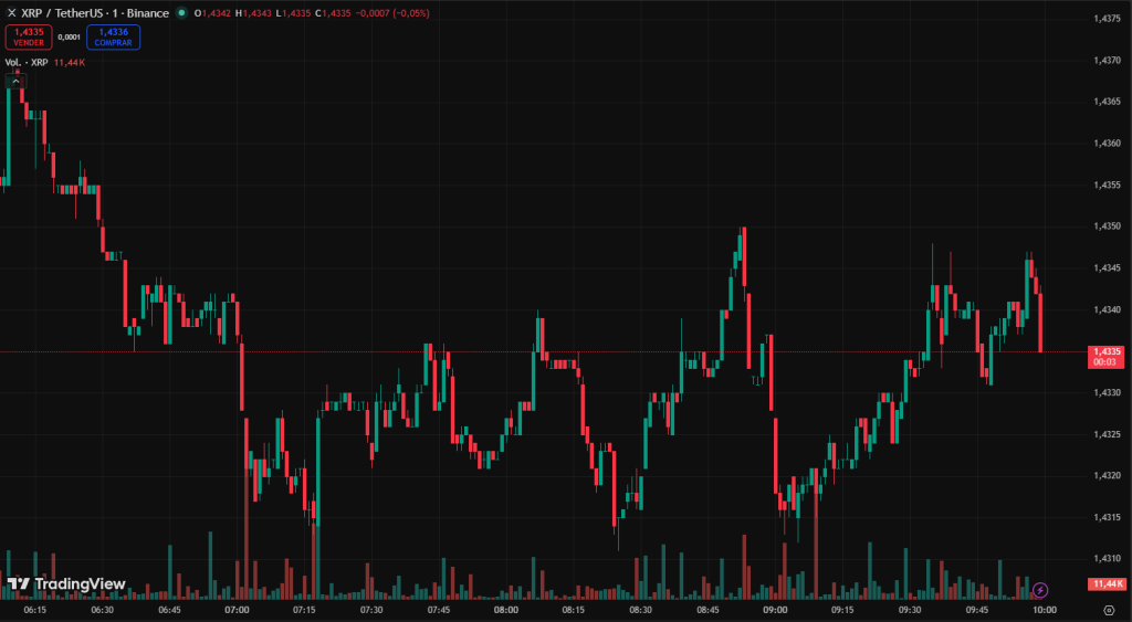 XRP continúa consolidando alrededor de $1.44, atrapado en un rango estrecho que técnicamente anticipa un movimiento fuerte en próximos días. Tras varios intentos alcistas, el precio sigue chocando con resistencia, aunque cada retroceso pierde fuerza, señal de que la presión vendedora comienza a debilitarse.