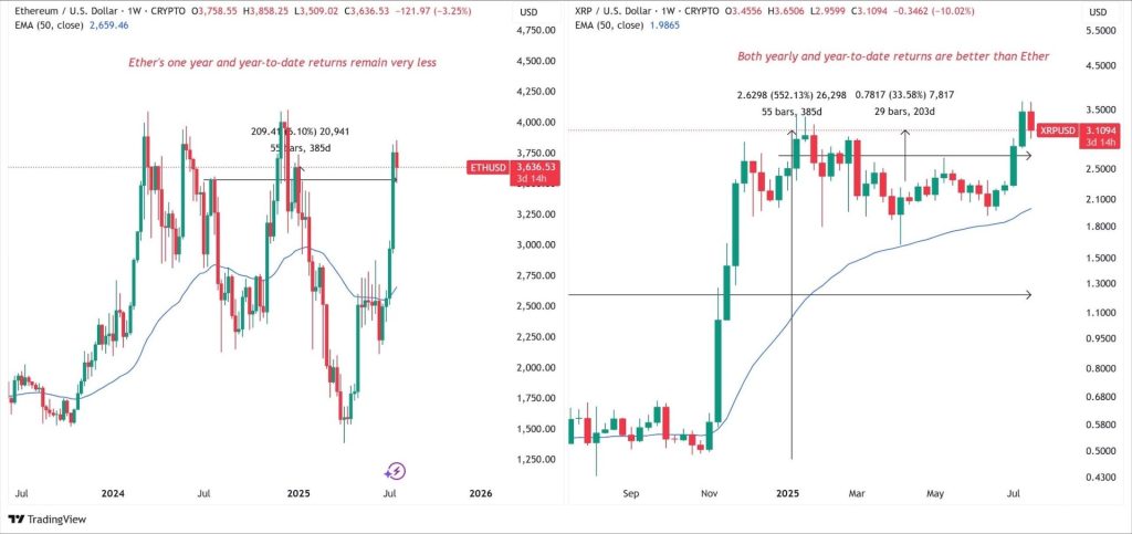 XRP ha superado a Ethereum en rendimientos anuales, pero la creciente adopción institucional de ETH podría revertir la tendencia en los próximos meses.