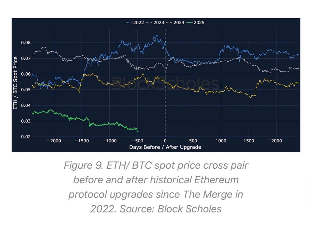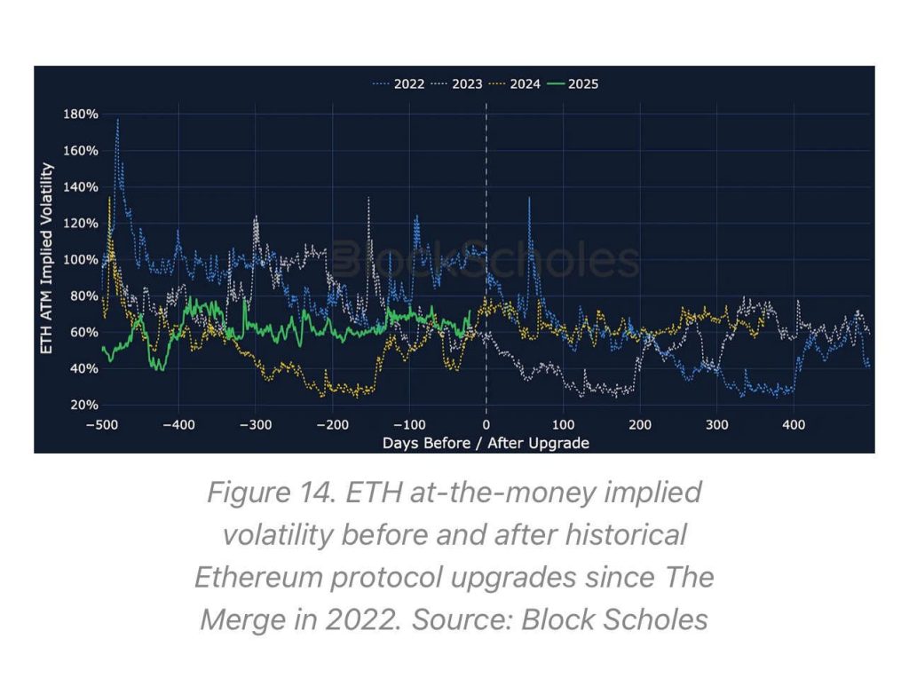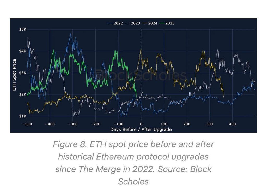 A pesar de la importancia técnica de Pectra, el precio de Ethereum ha oscilado lateralmente, con movimientos modestos en las últimas jornadas. De acuerdo con analistas de BlockScholes, esto puede deberse a varios factores: